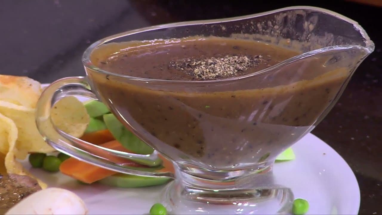 اسكبي مرق اللحم أو الدجاج تدريجيًا مع التحريك المستمر حتى يتكاثف الصوص.